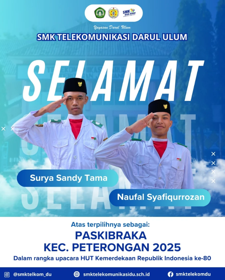 Peterongan, 17 Agustus 2025 – Prestasi membanggakan kembali diraih oleh siswa-siswa SMK Telekomunikasi Darul Ulum. Dua putra terbaik sekolah tersebut, Surya Sandy Tama dan Naufal Syafiqurrozan, resmi terpilih sebagai anggota Pasukan Pengibar Bendera Pusaka (Paskibraka) Kecamatan Peterongan Tahun 2025.